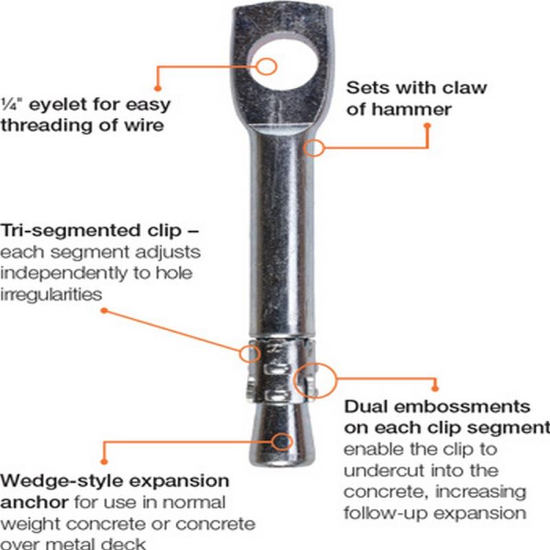 1/4" eyelet for easy threading of wire Tri-segmented clip – each segment adjusts independently to hole irregularities Dual embossments on each clip enable the clip to undercut into the concrete, increasing follow-up expansion